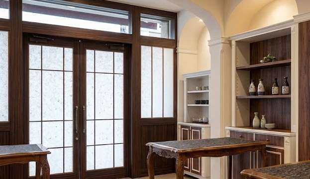 洋風のレストランから和食の業態へお店を変える場合など、大がかりな解体工事を行わずに既存の設備を活かす方法があります。例えば、店内に残っている洋風のテーブルや棚、入り口の建具(ドア)などに、落ち着いた色彩の和柄や木目のシートを上から直接貼る施工です。